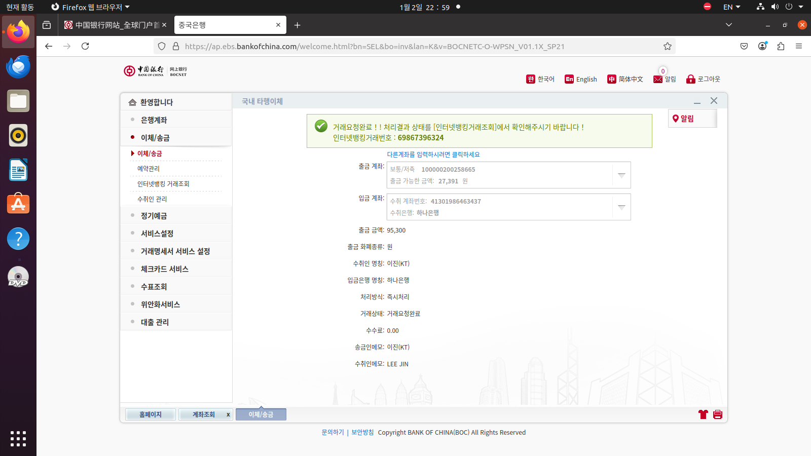 아래에서 보신 중국은행 계좌는 본인의 계좌이다. 오늘 토비새에 참석한 사람들 눈치가 ‘저거 핸드폰 판거 아니가’ 하는데 중국은행은 일정한 신용이 되지 않으면 계좌를 열어주지 않는다. 金부장님이라고 손수 인터넷 뱅킹을 열어 주셨는데 ‘그녀’ 가 내 지저분한 용모에도 불구하고 무엇을 보고 계좌를 열어 줬을까?…