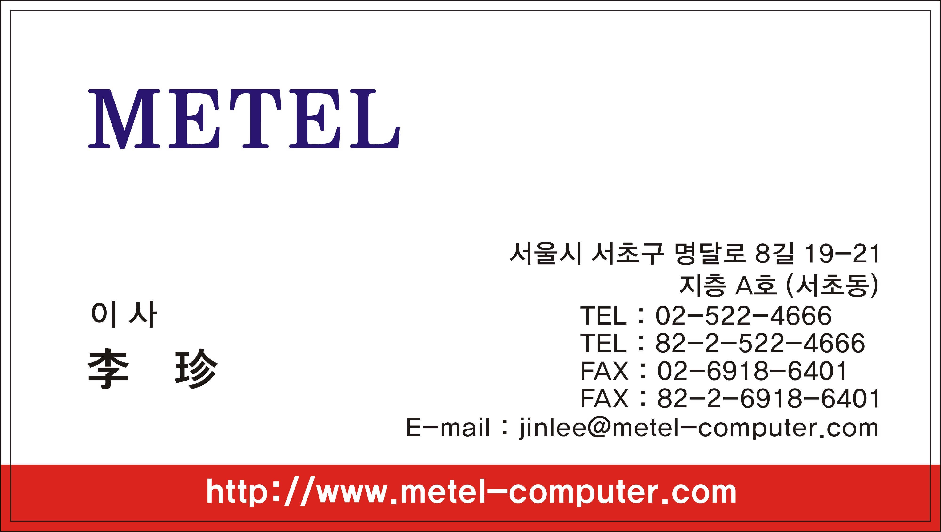 Dear Friends and Colleagues around the world; METEL renewed the system so that you can send the FAX, while it is dark night outside the R.O.Korea. When I go to the bed, I turn on the Canon so that I can receive your message while I am sleeping. The FAX machine number is +82-2-522-4666, over the night for you. P.S. Do not send the FAX by the WebFAX in the night. Because you should let me know the fact in the case you send the WebFAX for the day. Thank you. Best Regards, Jin Lee CEO of METEL Computer Thank you http://www.metel-computer.com