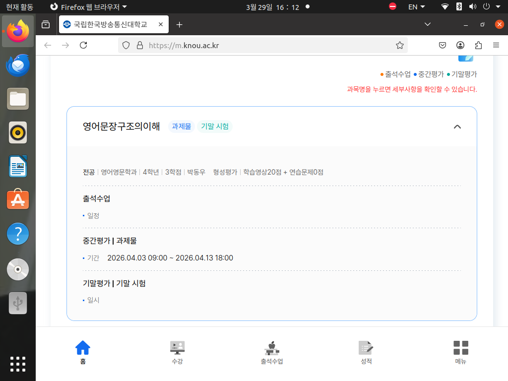 사유: (국립) 한국방송통신대학교 과제물 제출 기간, 4월 3일까지