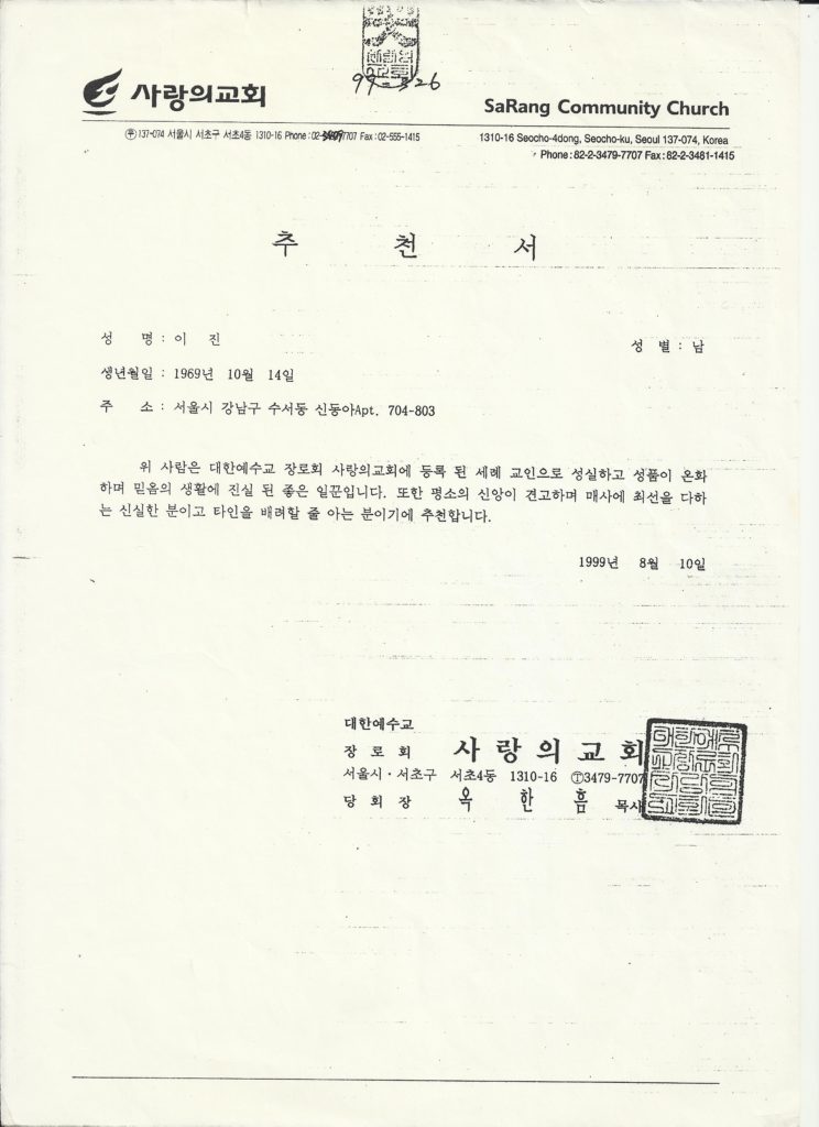 美 하바드대에서 추천서를 요구하는 부분이 있어서 故 옥한흠 목사님이 내게 주신 서류를 올려봤다.(원본은 내가 용산의 나진상가 2층에 근무할때 효성컴테크의 이 계산 사장이 가지고 있는 것으로 기억난다. 장충교회 집사였다) 『두 사람이 행하며 말하더니 홀연히 불수레와 불말들이 두 사람을 격하고 엘리야가 회리바람을 타고 승천하더라 엘리사가 보고 소리지르되 내 아버지여 내 아버지여 이스라엘의 병거와 그 마병이여 하더니 다시 보이지 아니하는지라…』(왕하 2:11-12)