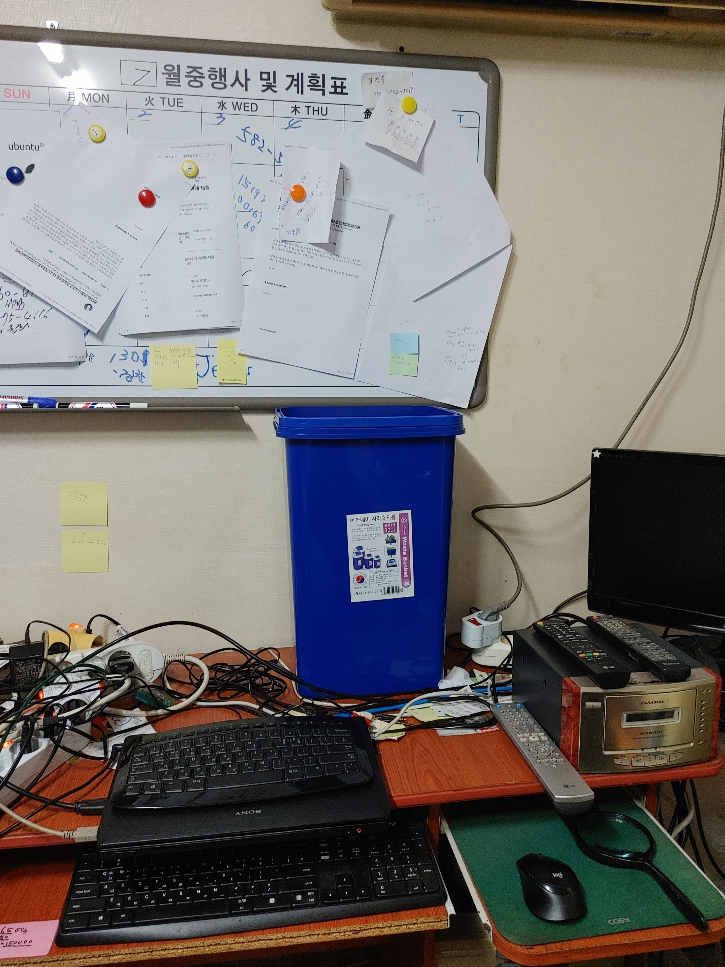 아래의 쓰레기통은 위에 보이는 에어컨에서 떨어지는 물을 받아내려고 구매한 것이다. 22,000원을 주고 구매했는데 일주일치 과자도 같이 샀더니 구박이다. 지금 독서실중 하나에 있는데 내가 소비가 과한 것은 사실인 것 같다. 내 친구중 하나가 서울대 수학과 박박사를 끝내고 버클리에서 금융공학을 전공했는데 그 녀석도 내 돈이 돌아가는 것을 이해하지 못할 것이다. 나는 십일조를 충실히 지킨다. 그리고 부족한게 있으면, 믿음을 가지고 기다리고 있으면 채워주신다. 하지만 분명한것은 거기에 따르는 노력이 있어야 한다. 나는 소니 노트북(laptop)이 두개가 있는데 主께서 공부를 하라고 선물로 주신것이다. 어제 밤을 새웠다. 토비새는 가지 못했는데 VCR(VTR)로 녹화해 놓았다. 언뜻 보니까 한놈은 헛소리 하고 있고 한분은 진리의 말씀을 지키는 것 같았다. 내일은 주일인데 오늘밤을 새울 수 있을지 모르겠다. 아버지께서 항상 어떤 일을 시작할때는 처음 시작은 절제해야 한다고 하셨는데 오후에 통신장애가 발생했었다. 내가 분명히 이야기 하는데 ‘신의 한수’ 에 엿을 먹은 알파고는 인공지능이 아니다. 아내가 집에 와 있을 것 같다…